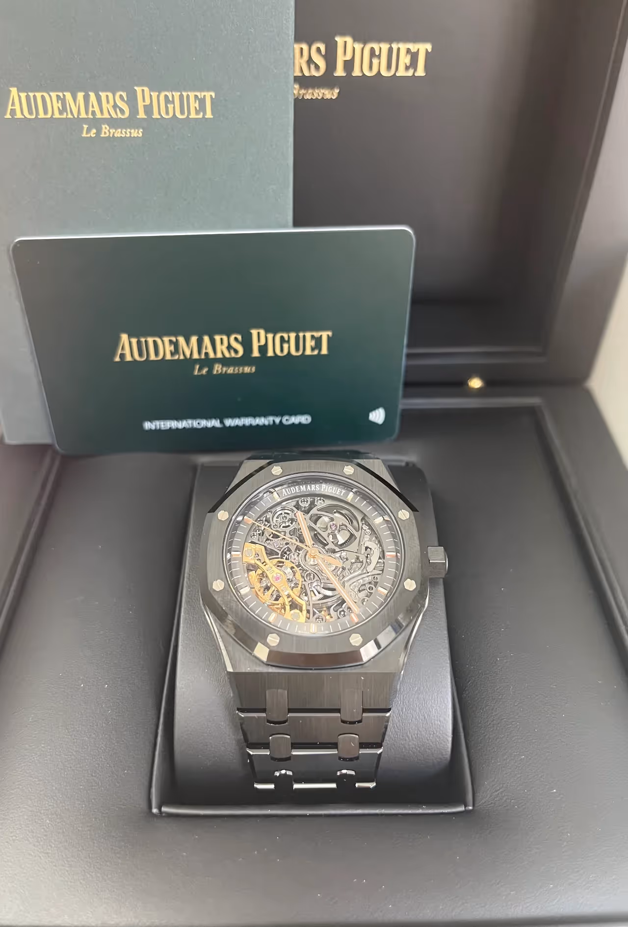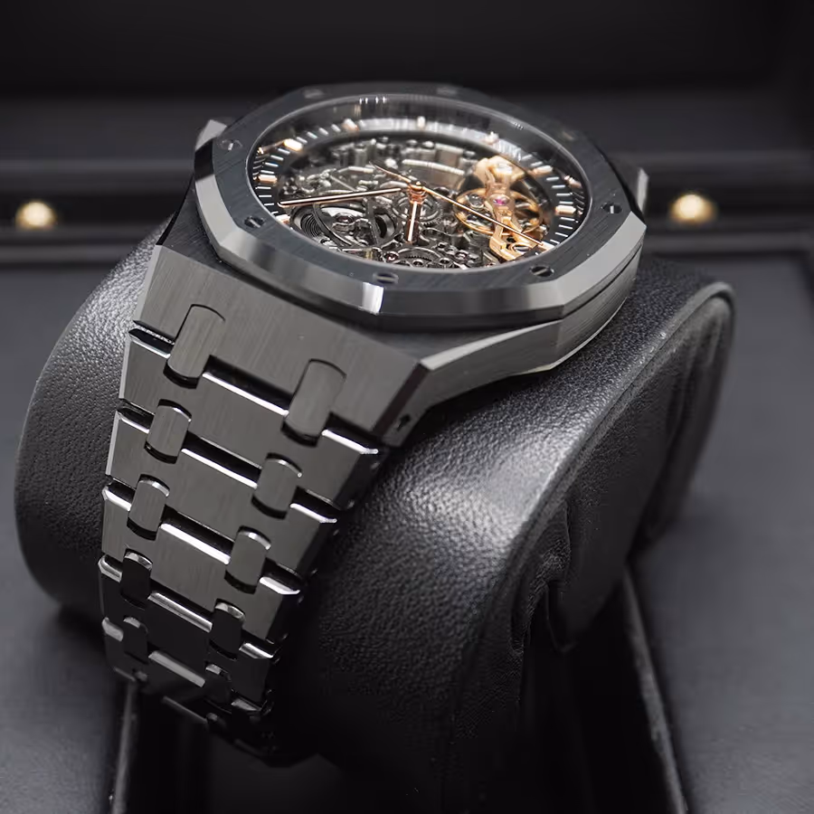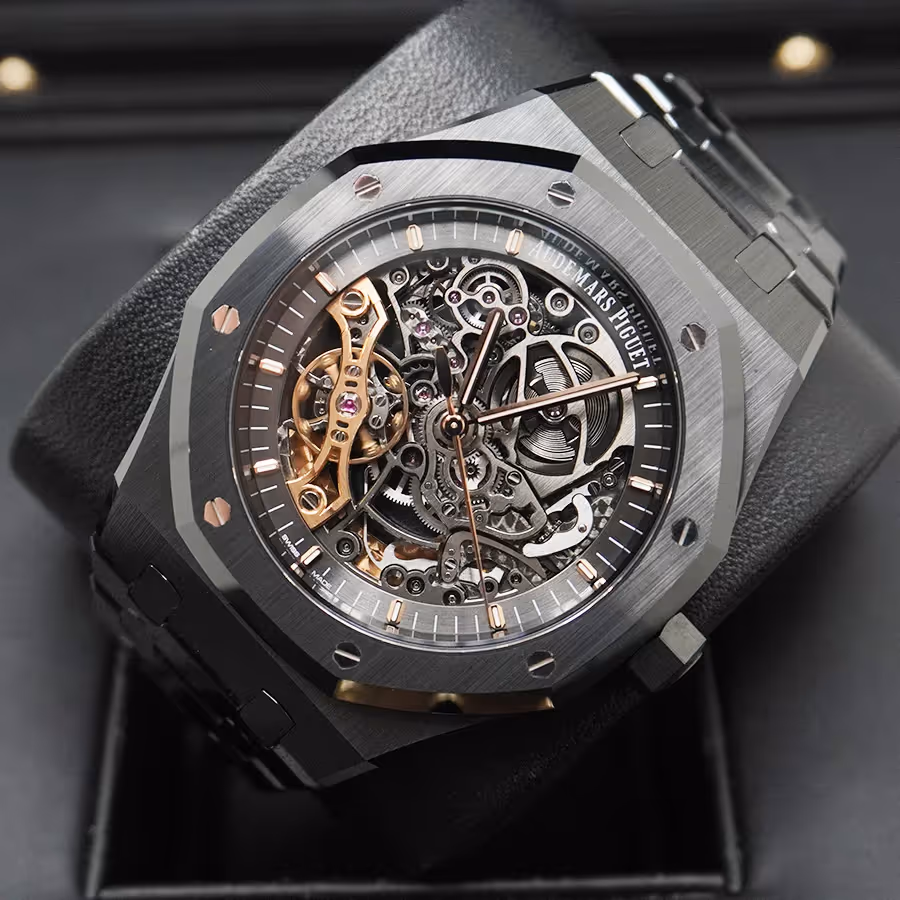 This innovative Audemars Piguet provides enhanced precision by incorporating two balance wheels on the same axis, showcased through a stunningly intricate openworked dial.