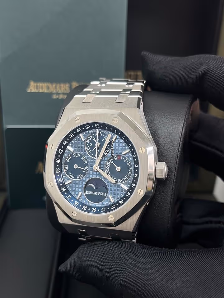 A 41 mm steel Royal Oak QP with blue “Grande Tapisserie” and full calendar indications. Houses the ultra-slim automatic 5134 behind glare-proof sapphire. Full Set—iconic design meets blue-chip haute horlogerie.