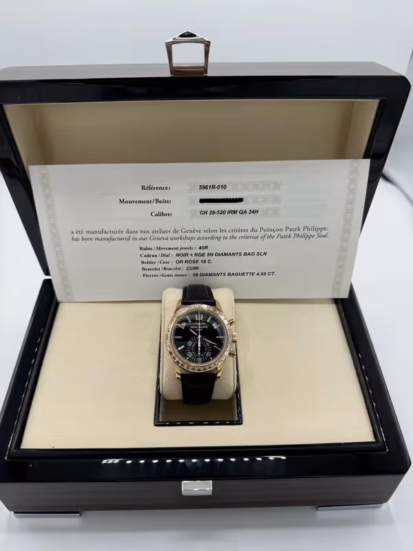 An opulent version of Patek Philippe's useful complication, this model in rose gold elevates its status with a bezel and hour markers set with flawless baguette-cut diamonds.
