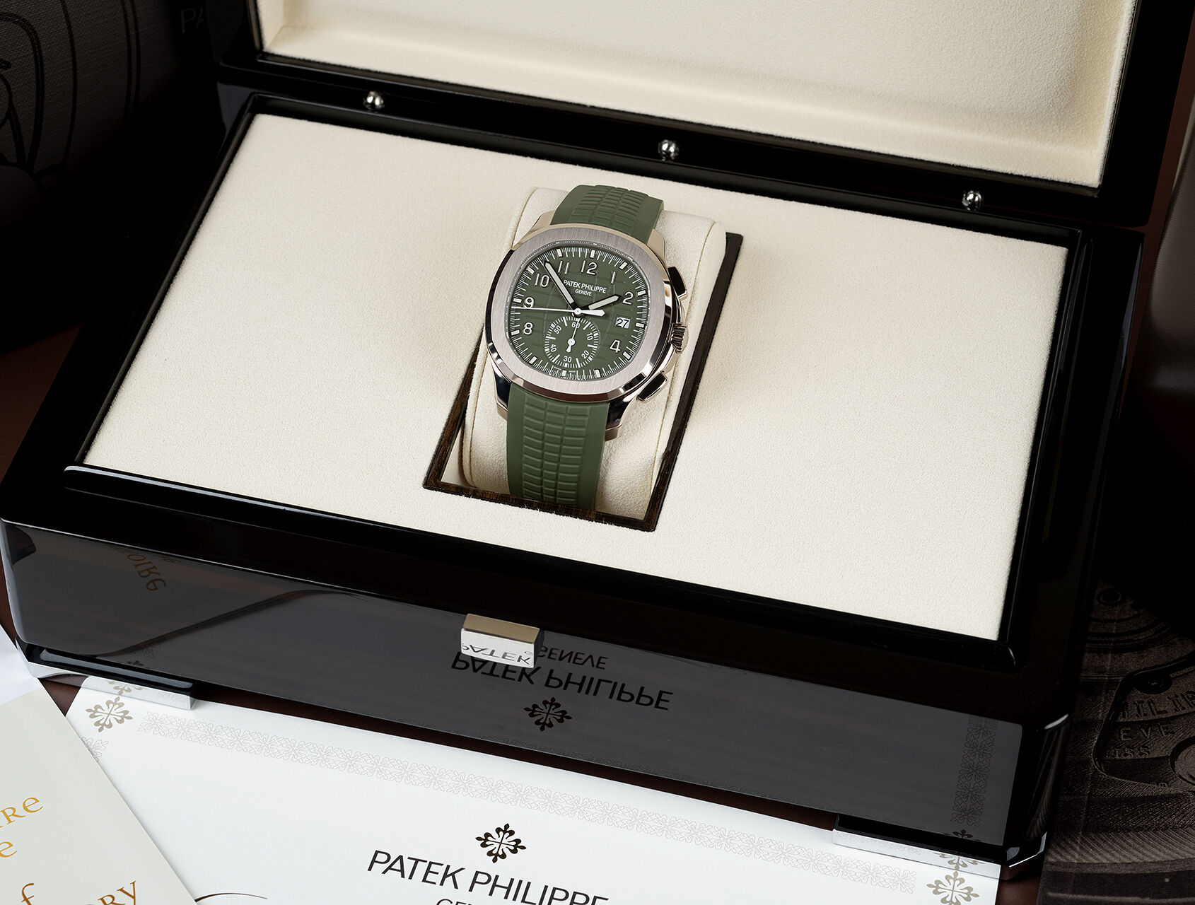 Encased in 42.2mm of exquisitely polished and satin-finished 18K white gold, the Ref. 5968G-010 is powered by the Manufacture Patek Philippe self-winding Calibre CH 28-520 C. This advanced movement features a sophisticated flyback chronograph complication, a central chronograph hand, a precise 60-minute counter at 6 o'clock, and a date aperture. The integration of a classic column-wheel control with a modern vertical clutch allows for seamless chronograph operation and permits continuous use of the chronograph seconds hand as a running seconds display without wear. The watch typically features a sophisticated dark dial, characteristic of the Aquanaut line, adorned with applied white gold numerals and luminous coating, ensuring optimal legibility. It offers a robust water resistance of up to 120 meters.