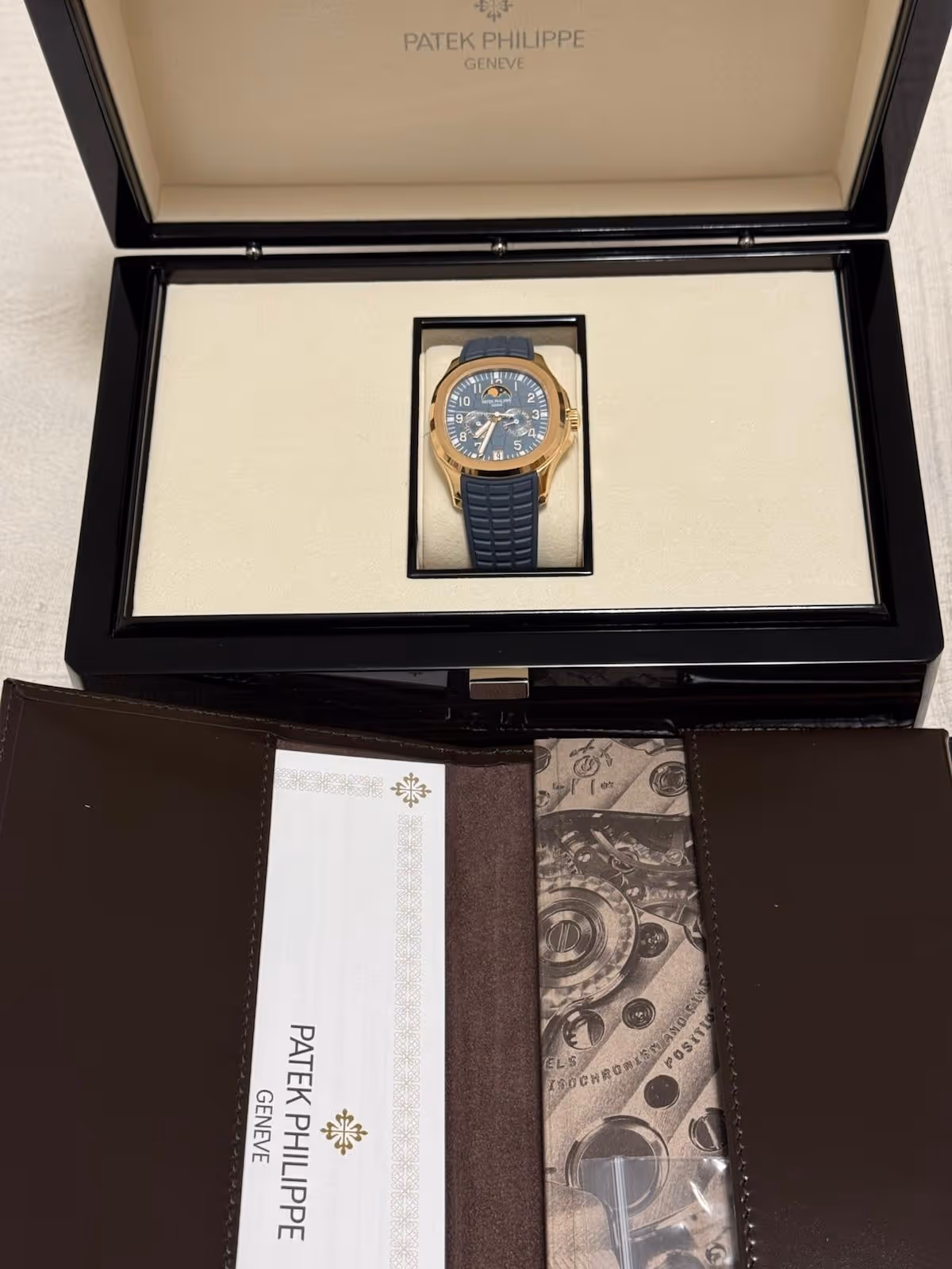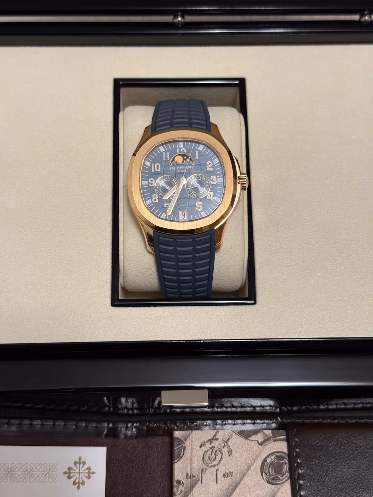 Patek Philippe unveiled the Ref 5261R at Watches and Wonder 2023, marking the first Aquanaut housing an annual calendar complication. The case is crafted in 18k rose gold, measures 39.9mm from 10 to 4 o'clock, a thickness of 10.94mm and presented in a beautiful vertical satin-brushed finish. The matte blue-grey dial adds another dimension to the atheistic and pairs particularly well with the rose gold.