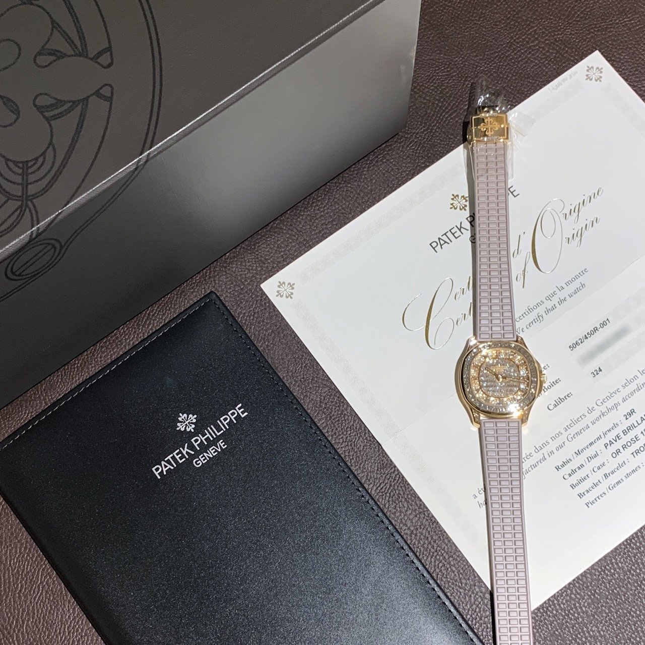 A dazzling expression of haute joaillerie, the Patek Philippe Aquanaut Luce Ref. 5062/450R-001 features a 38.8mm rose gold case lavishly set with diamonds, complemented by a gem-set dial and matching integrated bracelet. Powered by the self-winding Calibre 324 S, this exceptional timepiece combines contemporary Aquanaut design with exquisite gem-setting artistry and a sapphire exhibition caseback.