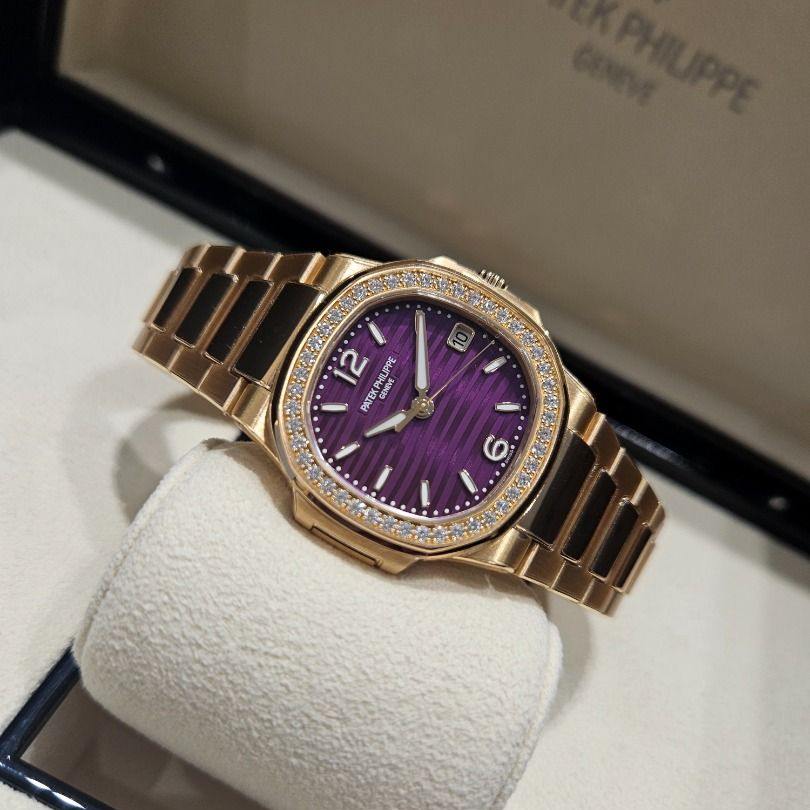A compact 32 mm rose-gold Nautilus with a purple lacquered dial and a diamond-set bezel for subtle sparkle. The reliable quartz calibre E23-250 S C keeps everyday time with a date window you can read at a glance. Finished on an integrated rose-gold bracelet with a comfortable fold-over clasp, this piece is Unworn / Full Set and ready to wear. A refined daily luxury with unmistakable Nautilus design.