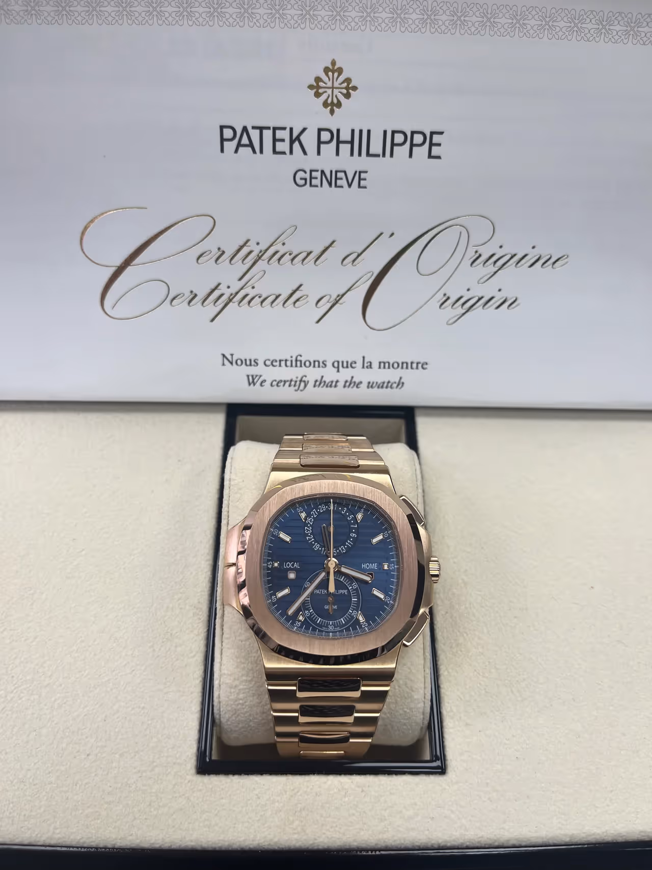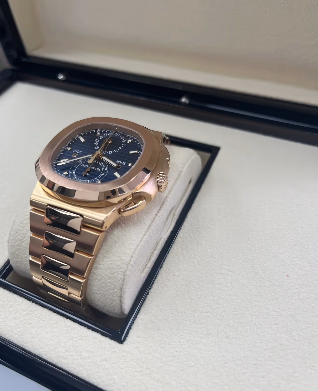 Patek Philippe presents the Nautilus Travel Time Chronograph Reference 5990/1 in a generous rose gold version contrasting with the sunburst blue dial featuring an embossed horizontal pattern and applied hour-markers. The baton-style hands are in rose gold with a luminescent coating. This new model combines three highly sought-after complications: a self-winding flyback chronograph, an easy-to-use Travel Time function (dual time-zone), and a date display, coupled with local time.