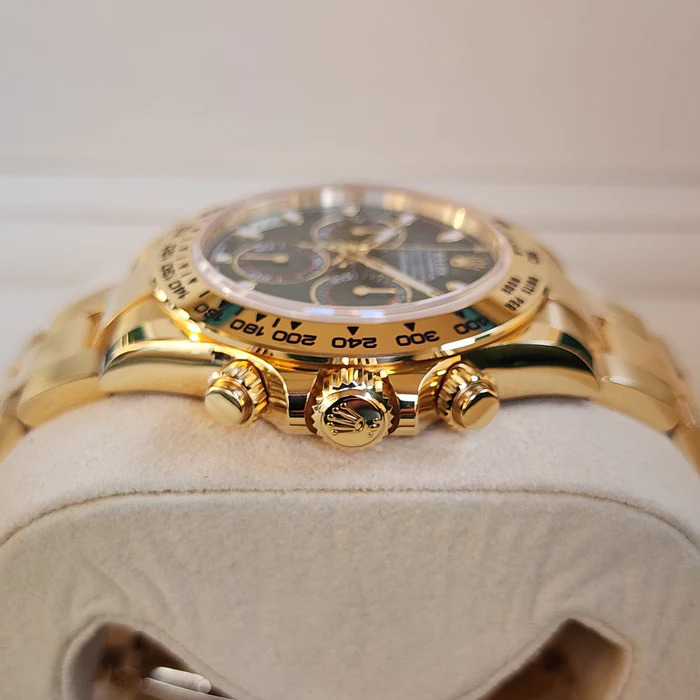 18k yellow-gold Daytona with the cult-favorite green dial and calibre 4130 chronograph. Solid gold Oyster bracelet and tachymeter bezel amplify presence and pedigree. New / 2021—the precious-metal Daytona collectors ask for by name.