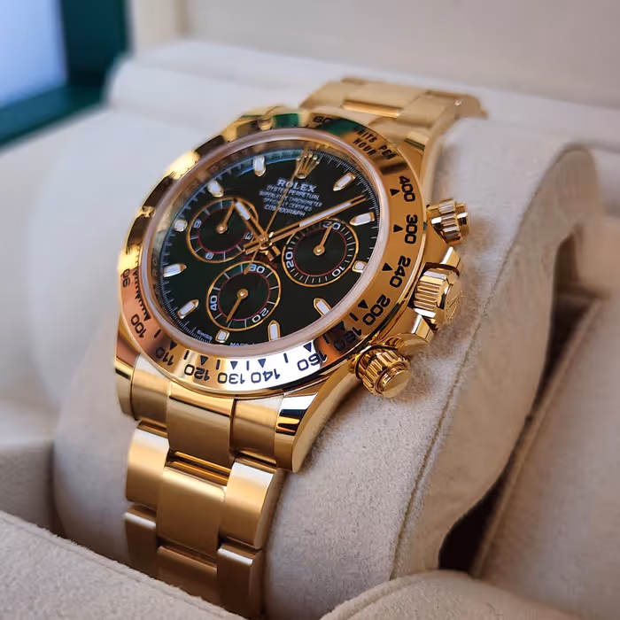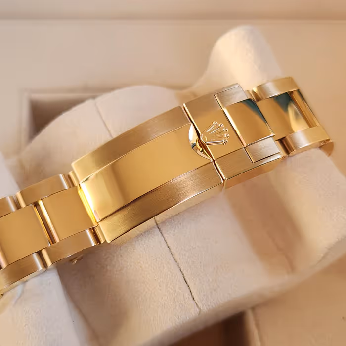 18k yellow-gold Daytona with the cult-favorite green dial and calibre 4130 chronograph. Solid gold Oyster bracelet and tachymeter bezel amplify presence and pedigree. New / 2021—the precious-metal Daytona collectors ask for by name.