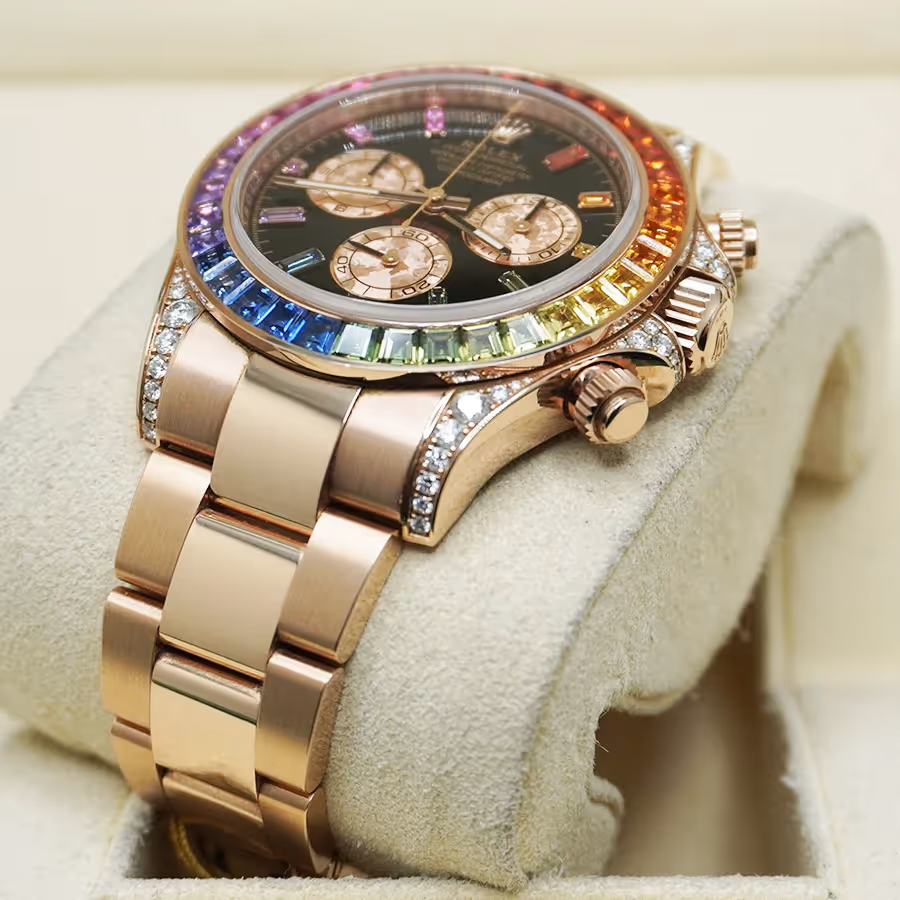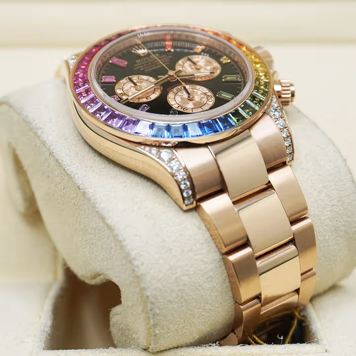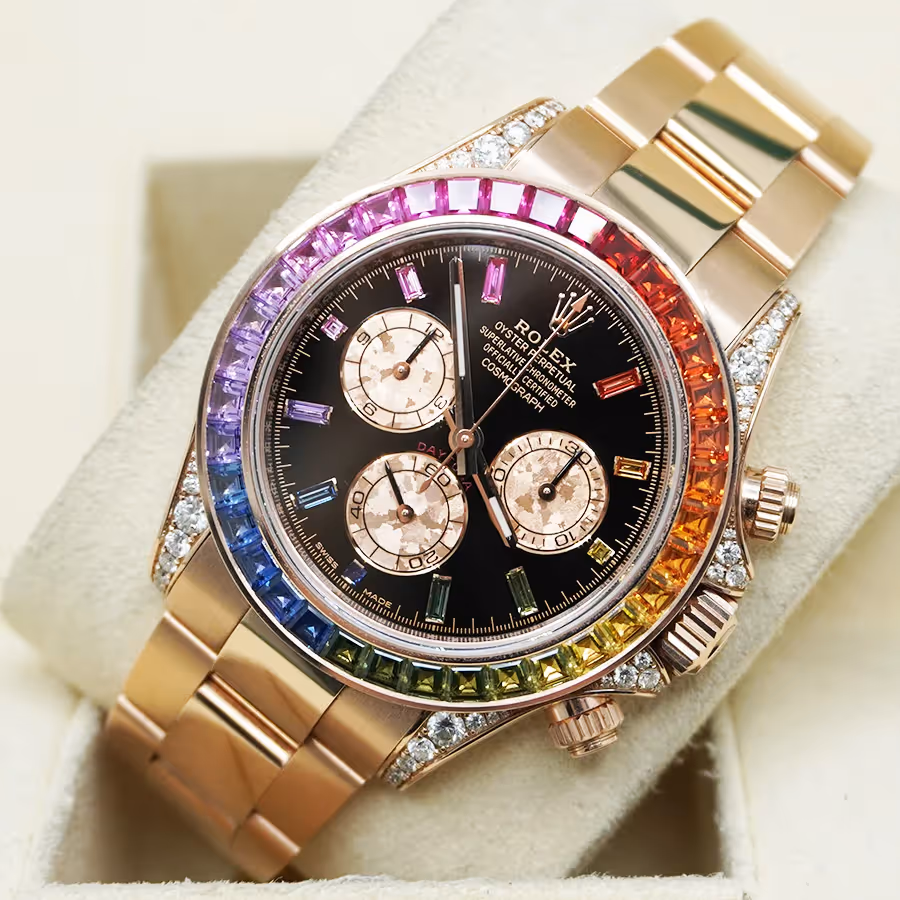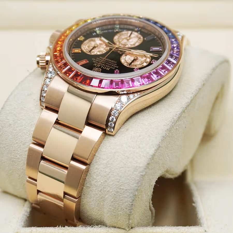 An exceptionally rare and vibrant Rolex Daytona crafted in precious metal, featuring a bezel set with a mesmerizing rainbow gradation of sapphires and diamond hour markers.