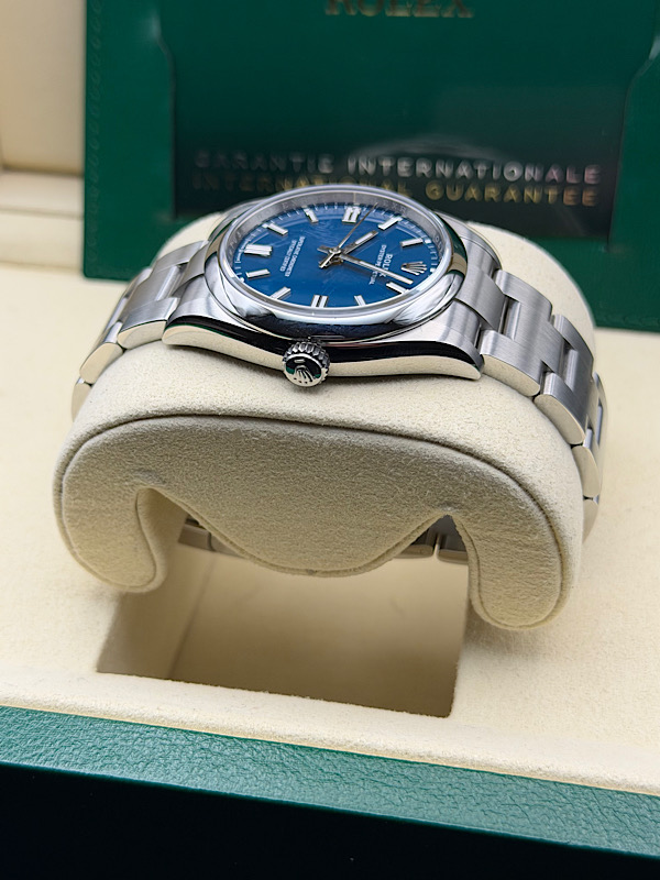 Distinguished by its medium blue dial, the Rolex Oyster Perpetual 126000 features a 36mm Oystersteel case with a domed bezel and scratch-resistant sapphire crystal. Crafted for everyday sophistication and reliability, the watch is fitted with a screw-down crown, Oyster bracelet with Oysterclasp, and is powered by the precise, self-winding Calibre 3230 movement for accurate, effortless timekeeping.