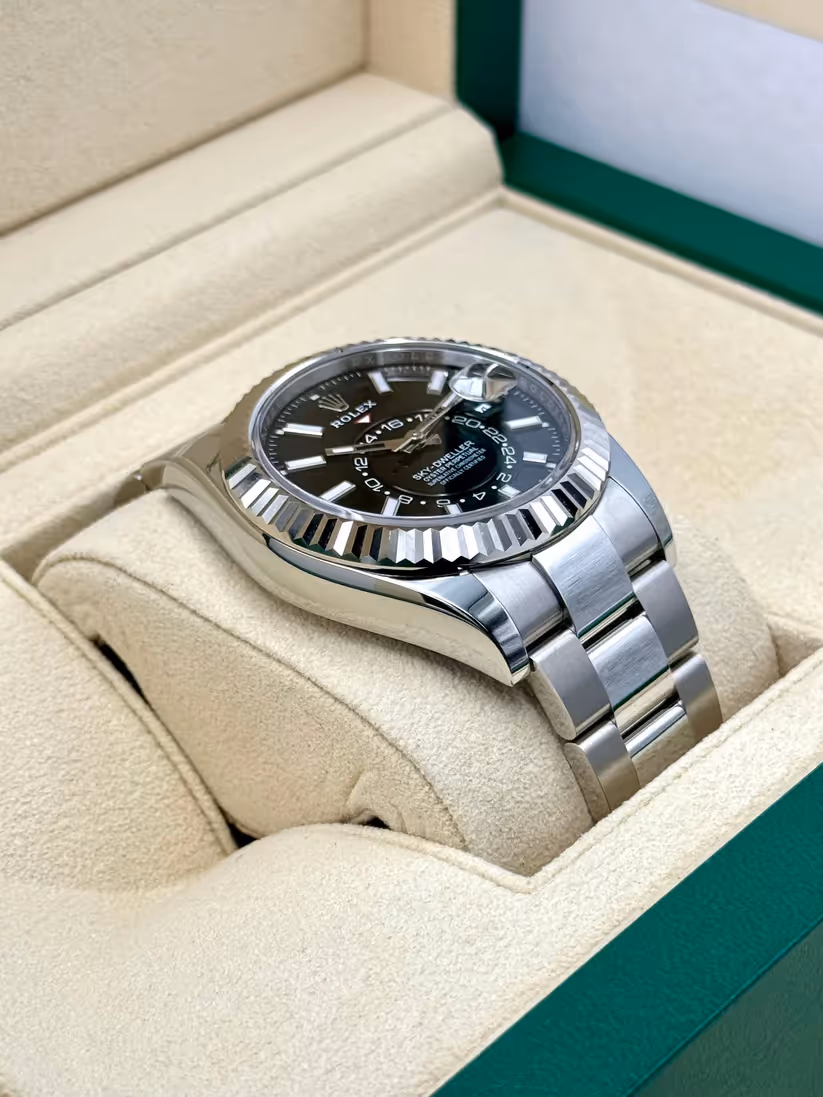 White Rolesor travel watch combining dual time with the Saros annual calendar, operated via Ring Command bezel. Calibre 9002, 42 mm case, and an Oyster bracelet for daily comfort. Brand New / 2025 / Full Set—Rolex’s most sophisticated traveler.