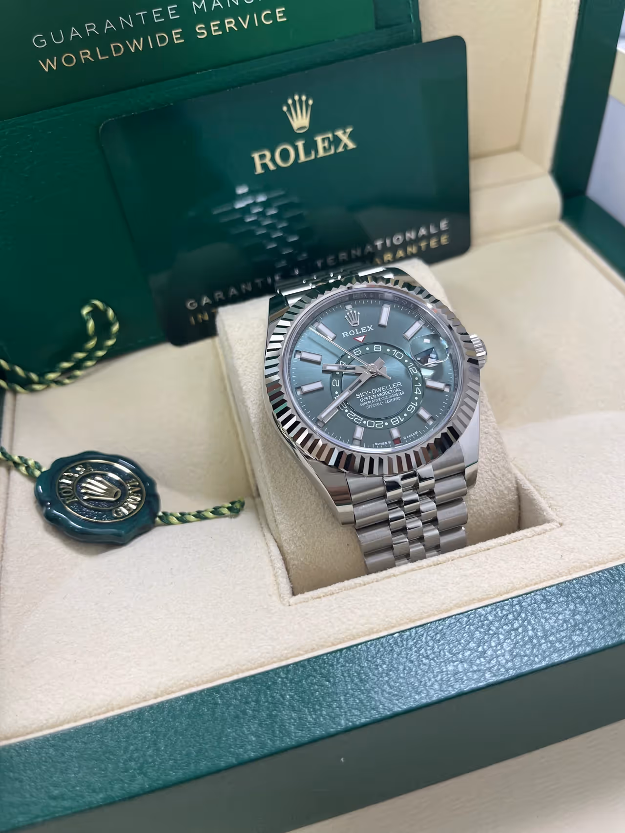 A popular and sought-after version of Rolex's most complicated watch, this Sky-Dweller features a striking and vibrant green dial, combining complexity with bold color.