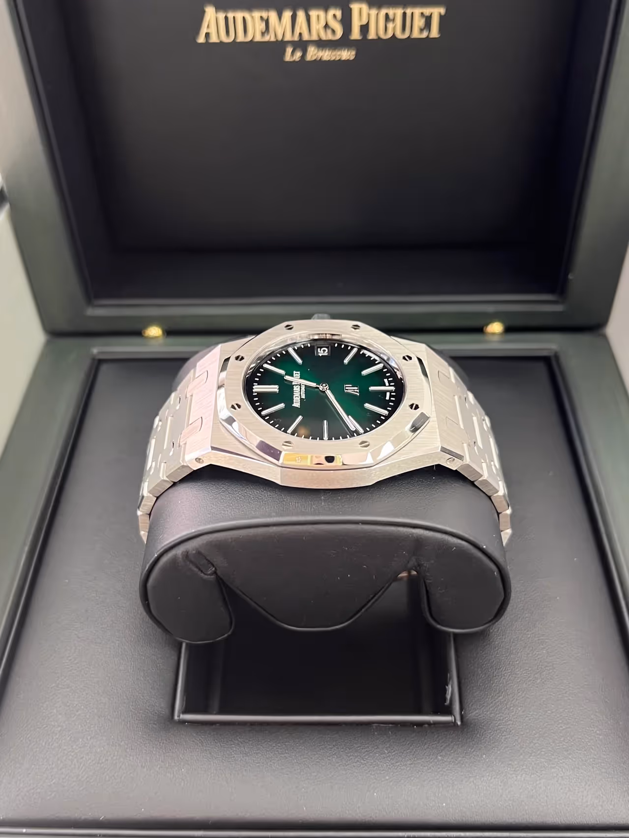 A highly coveted and luxurious version of the iconic "Jumbo," this Audemars Piguet is crafted in platinum with a stunning sunburst smoked green dial.